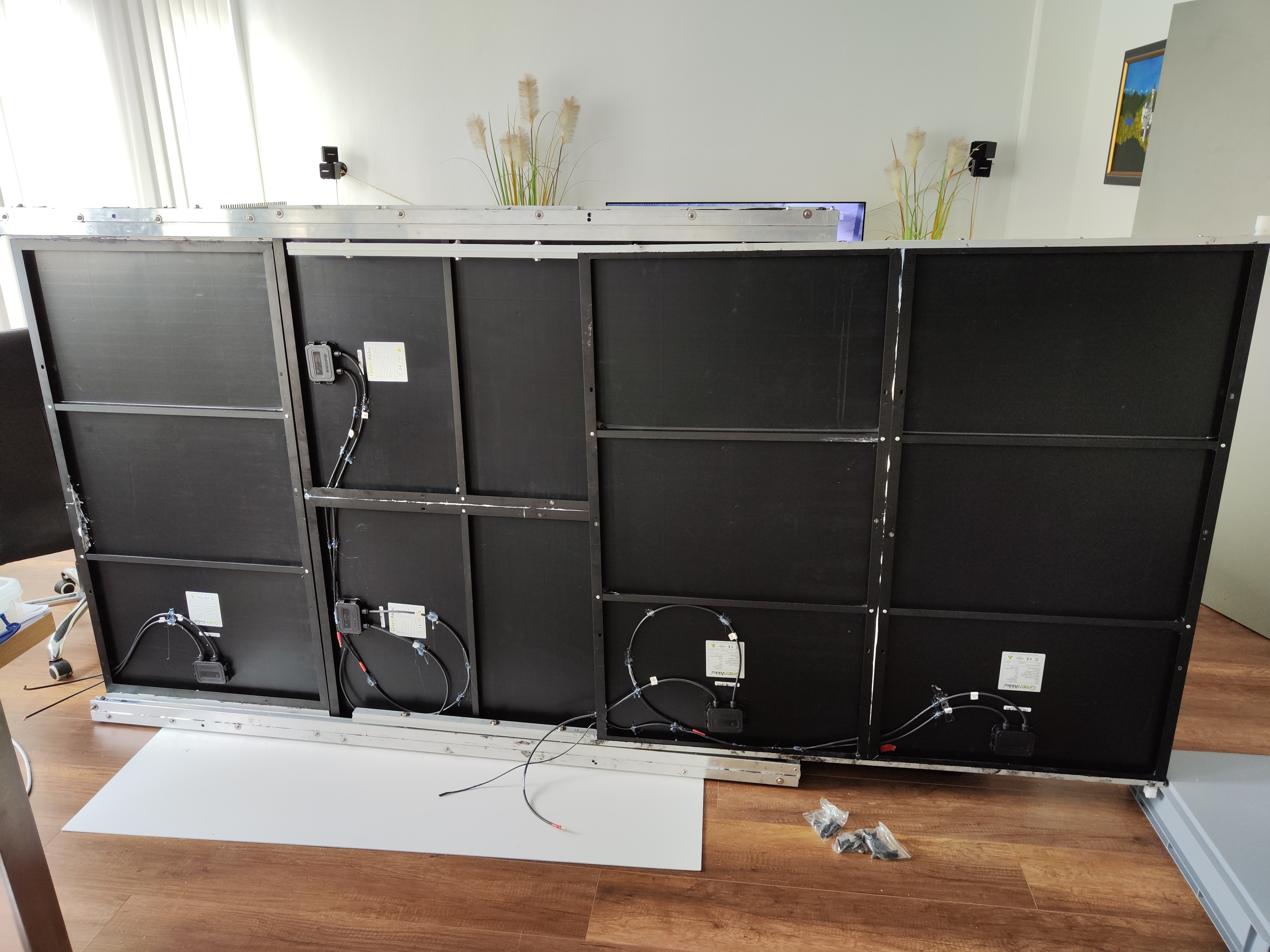 So, jetzt nimmt das Projekt Formen an. Leider kann man nicht so große Längen verwirklichen, da man nicht den gesamten Fahrtwind, den die Windschutzscheibe hoch leitet, unter die Module drücken will. Daher nutze ich nur ca 1,9m fixe Länge und 1,3m Breite. Dazu verbaue ich 3x 160 WP fix und darunter (während dem Parken nutzbar) ausziehbare 2x 160 WP Module, also gesamt 800WP. Als Pufferspeicher verwende ich 2x 200Ah LiFePo Akkus mit gut 4,5 kWh tatsächlich nutzbarer Kapazität. Mit nem 2,5 kW nominalem Wechselrichter (5kW kurzzeitig) kann ich dann elektrische Geräte, die Lightshow oder einen KFZ-Lader betreiben.